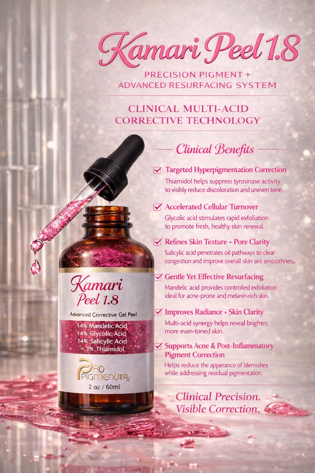 The Kamari Peel💕 1/8🤏🏿 is a high-performance, gel-based chemical peel featuring a powerful 14% Lactic Acid + 14% Glycolic Acid + 14% Salicylic Acid complex, enhanced with tranexamic acid and alpha arbutin to support visible skin brightening and discoloration management. The gel delivery system allows for smooth, controlled, and even application, making it ideal for customized professional treatments.